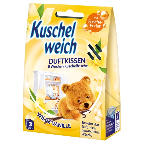 Saszetki zapachowe do szafy/szuflady lub samochodu wypełniają wnętrze przyjemnym, delikatnym, odświeżającym aromatem, który utrzymuje się przez wiele tygodni. Perełki świeżości zawarte w Kuschelweich Duftsäckchen pomagają utrzymać świeżość ubrań przez bardzo długi czas. Saszetki pachną nawet do sześciu tygodni. Wystarczy umieścić zapach w szafie/szufladzie lub powiesić na wieszakach wewnątrz szafy.