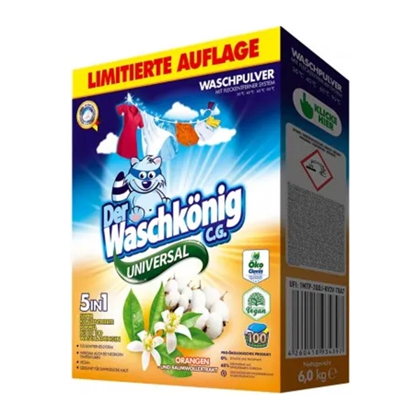 Super nowość! Uniwersalny oraz bardzo skuteczny proszek do prania Der Waschkönig C.G. o pojemności 6 kg z ekstraktem z pomarańczy i bawełny. Bardzo wydajny, wystarcza na 100 prań. Wyróżnia się nowym, intensywnym zapachem pomarańczy. Bardzo dobrze rozpuszcza się w wodzie. Posiada wysokie właściwości odplamiające oraz przywracające kolor.
