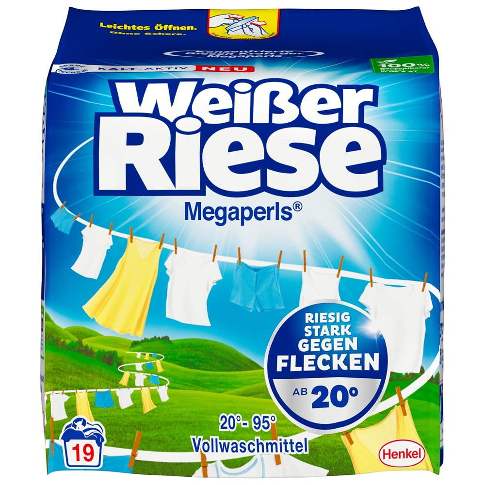 Weisser Riese Megaperls to silnie skoncentrowany proszek do prania tkanin jasnych, białych i kolorowych. Innowacyjna formuła zapewnia aktywne działanie już w 20 stopniach oraz usuwa nawet najbardziej uporczywe plamy. Dzięki aktywnej formule głęboko wnika w głąb tkanin nie niszcząc włókien, a jednocześnie pozostawia świeży i przyjemny zapach na długo. Można stosować również do prania ręcznego.